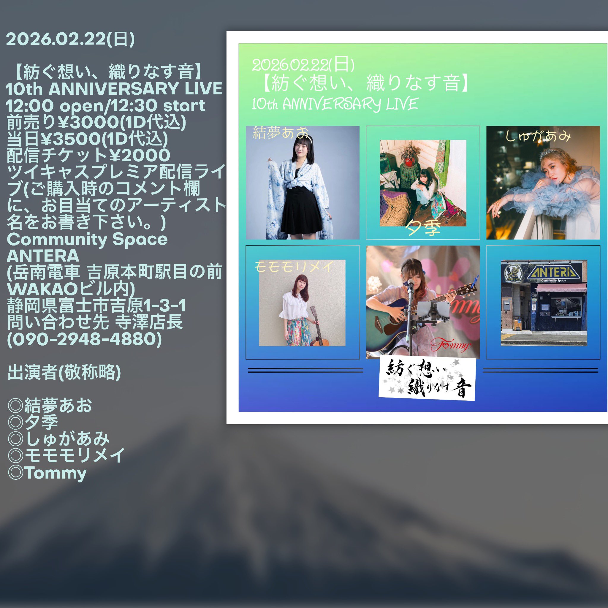 紡ぐ想い、織りなす音2026.2.1(日)更新日時2026.2.22(日)OPEN 12:00 / START 12:30場所community space ANTERA出演者結夢あお / 夕季 / しゅがあみ / モモモリメイ / Tommyチケット前売3,000円当日3,500円オンライン配信なしcommunity space ANTERA静岡県富士市吉原1-3-1 wakaoビル